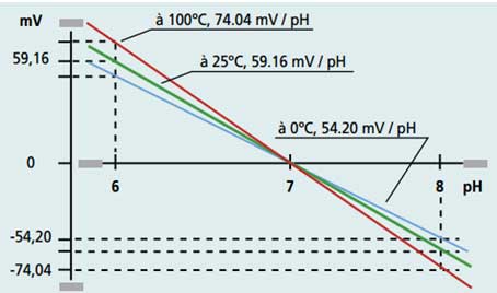 Calibration: establishes the difference between what is measured and the response. After adjustment, the pH-meter determines the gradient of the actual response (the theoretical value is 59.16 mV/pH at 25°C) and the response at 0 mV (theoretically pH=7).